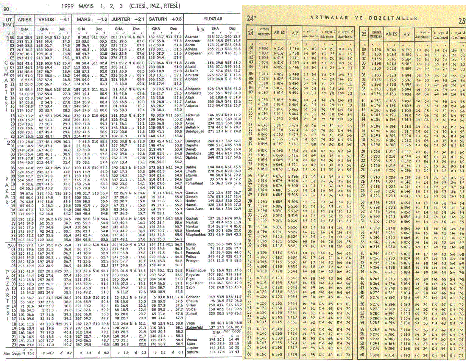 02 MAYIS 1999 günü 17:25:26 ZT’da 30° 09'N - 078° 45'W mevkiinde Alphard yıldızının GHA ve Dec değerleri ne olur?